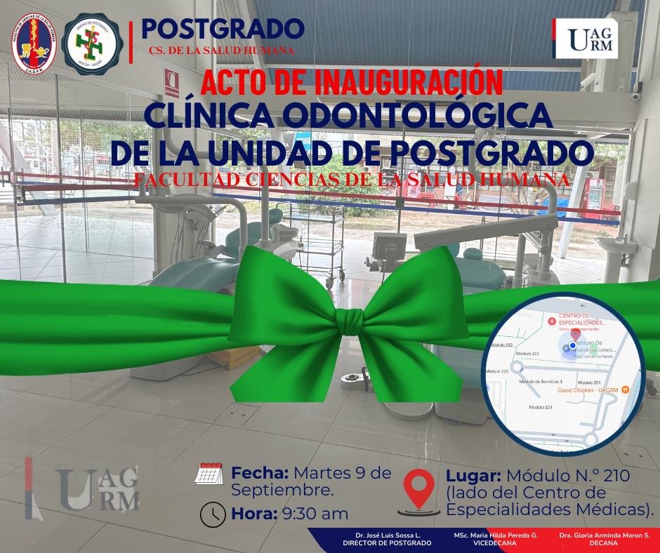 Acto de inauguración Clínica Odontológica de la Unidad de Postgrado en Salud, en un esfuerzo por llevar al mas alto nivel la preparación académica odontológica, con equipos de primer nivel e infraestructura de vanguardia, inaugura operaciones con la presencia de autoridades, profesionales, funcionarios y publico en general, quedando al servicio de los profesionales que requiera una capacitación posgradual en el área odontológica.